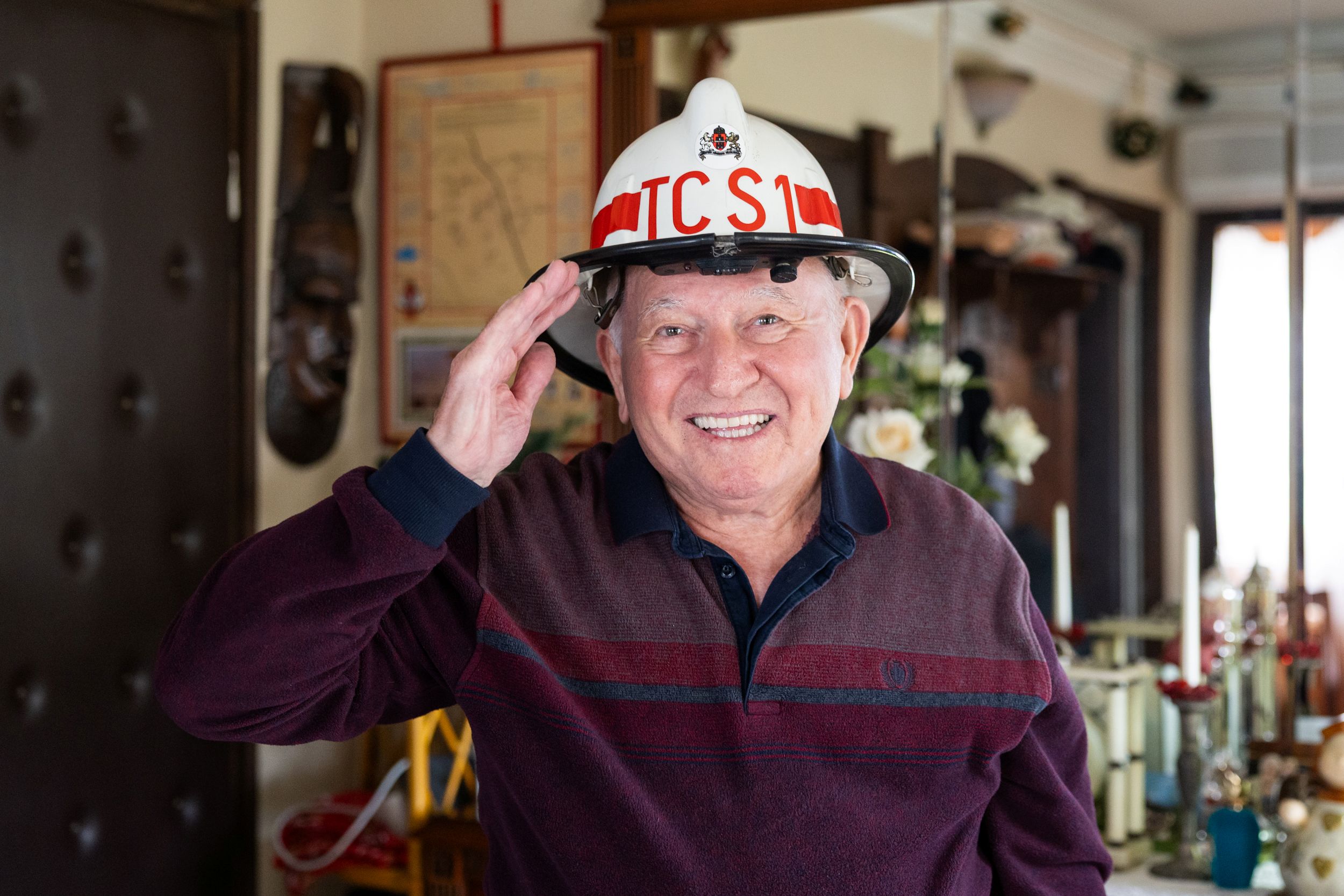 A nyugalmazott tűzoltó ezredes ezután szobájába vezetett, ahol büszkén mutatta meg relikviáit – köztük azt a sisakot, amelyet 1991-es nyugdíjba vonulásáig viselt.