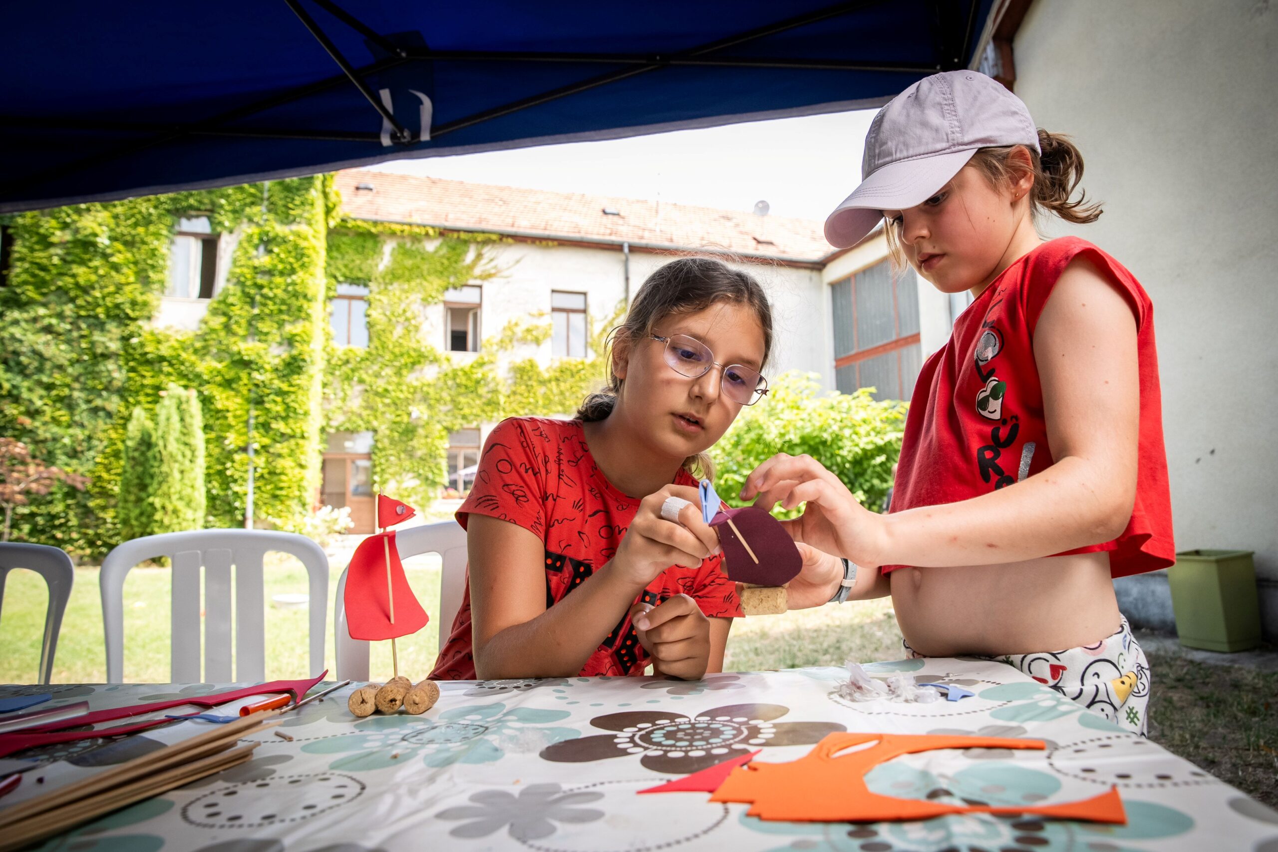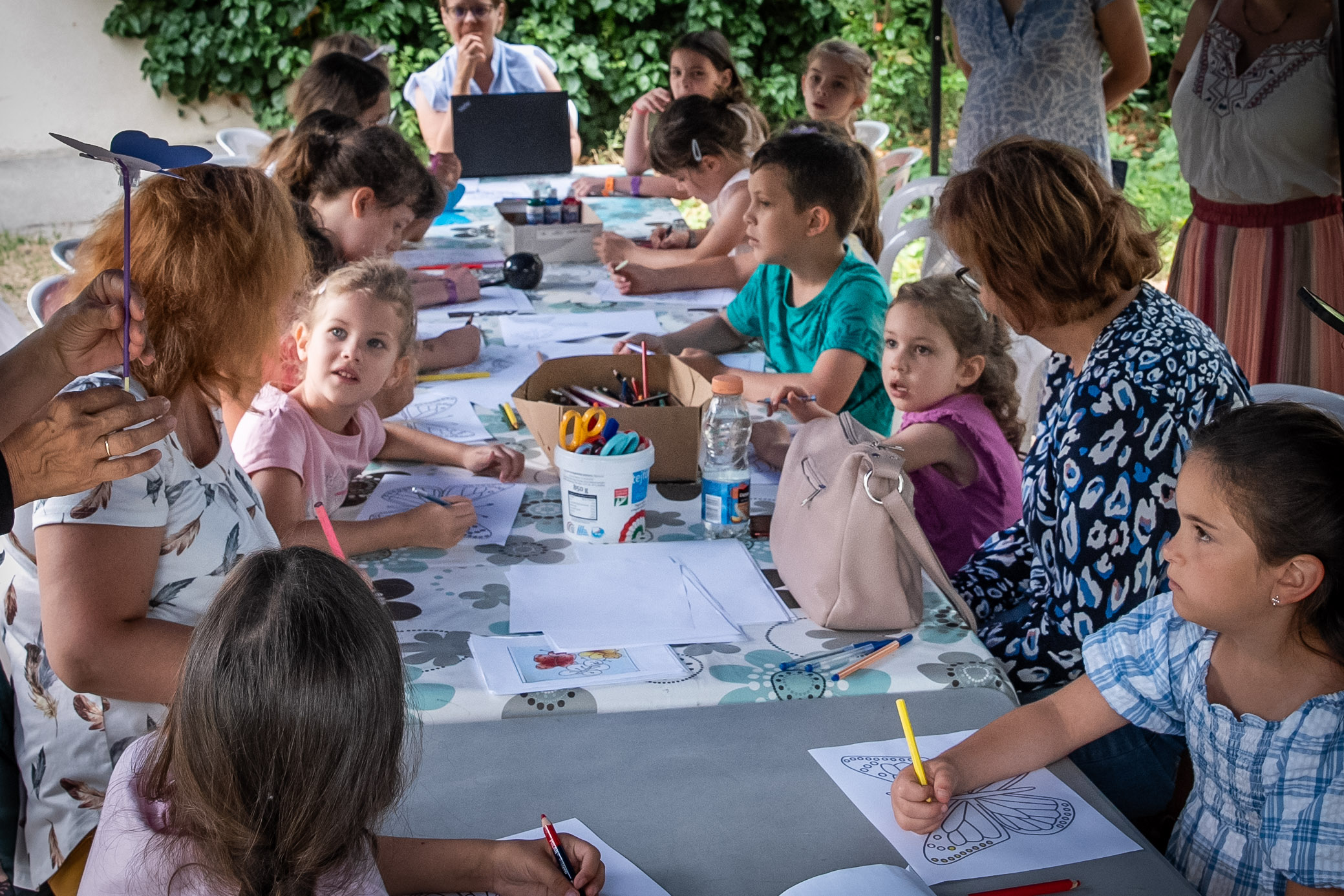 A Mókatábor után visszatérünk az udvar másik végébe, ahol a sok-sok szülő üli körbe az asztalokat. Ők éppen a Páratlan vakáció nevű ingyenes programon vesznek részt a gyerekekkel. Most épp pillangókat festenek különböző színekben, de a nyár délelőttjein mindig más történik. A cél a közösen eltöltött minőségi idő.