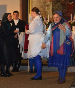 Szó esett a keresztelői öltözékekről is, amelyek különleges szerepet töltöttek be a palotai hagyományban. A gyermekeket már születésük után hamar megkeresztelték – a magas gyermekhalandóság és a mély vallásosság miatt ez kiemelten fontosnak számított. A keresztelői takaró fehér volt, finoman hímzett és slingelt; alatta rózsaszín vagy kék réteg jelezte, milyen nemű gyermek érkezett a világra. Gyakran ugyanazt a pólyát használták, amelyben korábban valamelyik szülőt is megkeresztelték – így a viselet szép családi emlékeket őrzött.